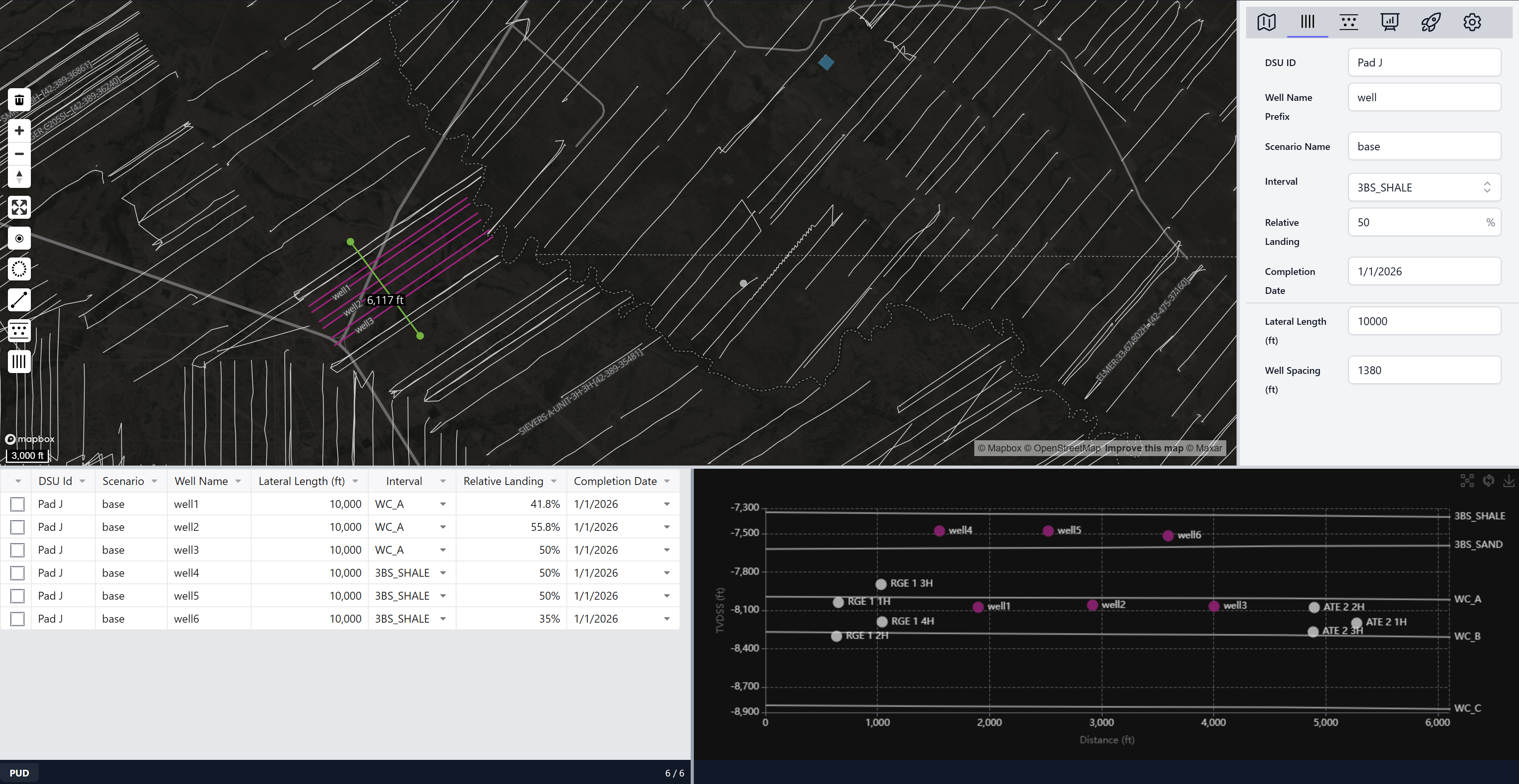 Use the intuitive map and gunbarrel interface to draw proposed horizontal wells. Drag and edit well patterns—or import from your inventory. Visualize your plan spatially and in cross-section.